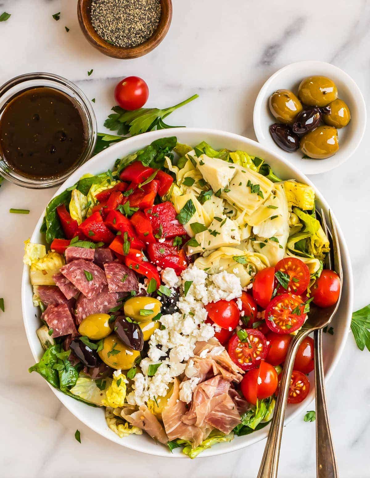 Fresh lettuce, tomatoes, cucumbers, olives, pepperoncini, sweet peppers, ham, turkey, salami, pepperoni, provolone, mozzarella, house made balsamic dressing.